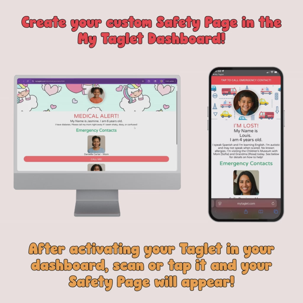 The My Taglet Dashboard is our online portal where you activate your Taglets and create a free Safety Page for each person. This page can include emergency contacts, allergies, medical instructions, and more—so if someone finds your loved one, they can scan the tag and get the info they need.