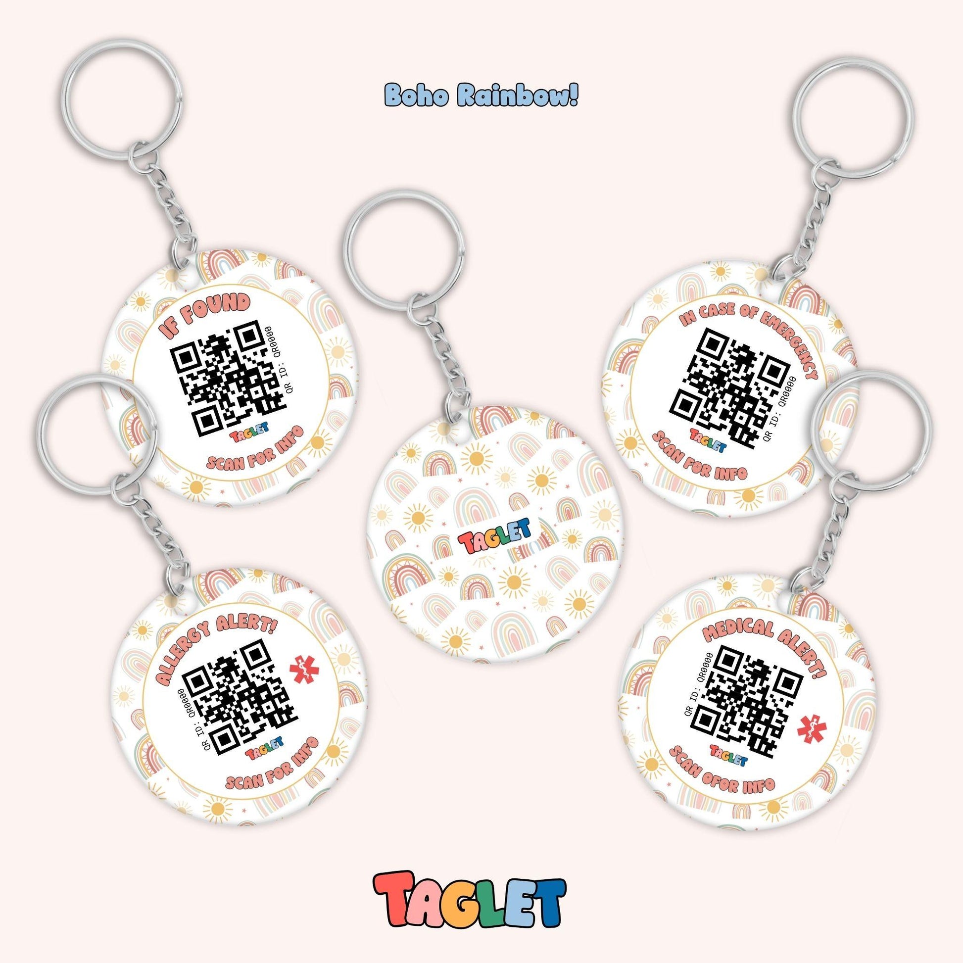 The Sweetheart Pack features your choice of six adorable designs—from pink bows and boho rainbows to mermaid scales, polka dots, and more. Each keychain includes a scannable QR code that links to your child’s private Safety Page when activated.